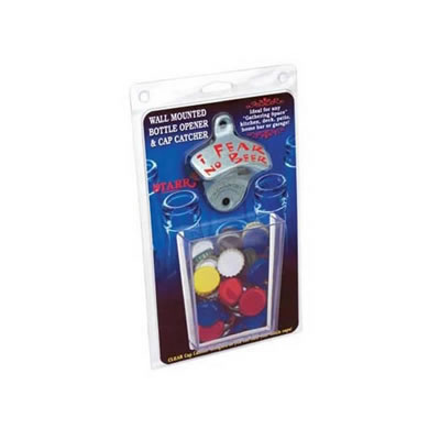 Metal Wall Mount Bottle Opener and Bottle Cap Catcher - "I Fear No Beer" Starr bottle Opener. One of the oldest and well known bottle openers in the United States. The company that makes these has been manufacturing bottle openers since 1925. You will not find a finer bottle opener. Bottle Cap Catcher Included!