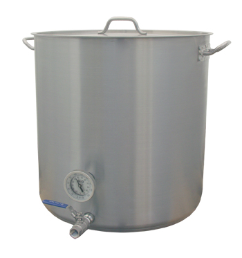 Our famous MoreBeer! Heavy Duty Brew Kettles are now fully assembled Mash Tuns! Each kettle has two 1/2" threaded couplers welded to them, a thermometer, and a false bottom. The bottom outlet is very unique with male threads on the outside (for connecting a ball valve) and female threads on the inside for connecting whatever you wish. Check out these features!,,They Will Last a Lifetime!,Constructed from durable, long-lasting stainless steel, these kettles are virtually dent proof. Over the years, we have heard countless stories from brewers who have ruined their thin-walled kettles by dropping and denting them. This is no longer an issue with these beefy, super-thick kettles.,,Tri-Clad Bottom,Our kettles are built with a tri-clad bottom featuring an aluminum core sandwiched between two layers of stainless steel. Aluminum allows for even heat distribution while the food-grade stainless steel is the only metal in contact with your wort. Even heat distribution eliminates hot spots, which prevents scorching of your malt and makes cleanup a breeze!,,Seamless - Made from a single piece of metal,Our kettles are drawn, meaning the kettle is made from one piece of stainless steel. No welded seams.,,Heavy Duty Handles!,The handles on these kettles are just as heavy duty as the rest of the kettle. This is because they are made from rolled stainless steel, which is strong and easy on your hands.,,Mash Tuns include a false bottom and a high quality thermometer. The 18-gauge stainless steel false-bottom features a perforation of 3/32 holes on 5/32 centers. This is considered standard commercial sizing. If the perforation is larger, you get too much grain husk material falling through. If the perforation is smaller you risk stuck mashes when using flaked grains or high percentages of wheat - especially when using a pump to recirculate the mash., ,Specifications,,,10 Year Warranty from MoreBeer!,,,Food Grade Stainless Steel with brushed finish will stay good looking for years,,,Extra thick!! 1.2 mm thick sidewall and a 5mm thick bottom,,,Includes stainless lid and handles,,,The same kettle we use in our famous BrewSculpture Brewing Systems,,,Inner dimensions are 19.75" Tall x 19.75" in Diameter