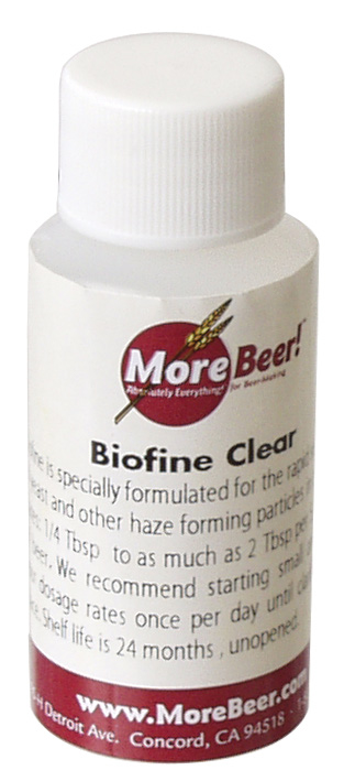 A clarifier that has received attention on The Brewing Network and is used by several of our commercial brewer friends. While beers cloud for different reasons and there is not one silver bullet to clear all beers, Biofine has proven effective in most situations. It is an easy way to help ensure clarity without having to filter.,,Biofine strips out all remaining yeast in 24-48 hours! Speeds up the aging and clarify process by 2-3 weeks! You'll find a layer of darker yeast that settles on top of your yeast bed in your fermenter. This layer is thicker than normal and acts as a blanket. This settling process avoids your yeast from being disturbed as you move your carboy. Biofine brings out maltiness and accentuates esters produced by yeast.,,Biofine Clear is a purified colloidal solution of silicic acid (SiO2) in water that has been specially formulated for the rapid sedimentation of yeast and other haze forming particles in beer. (Vegan friendly - no animal products) Shelf life is 24 months from date of manufacture, unopened.,,Dosage Rates: 1/4 Tbsp (3 ml or 1/10oz) to as much as 2 Tbsp (31 ml or 1 fluid oz.) per 5 gallon batch of beer.,Store in cool, dry conditions above 41 degrees F and do not allow the product to freeze.,Some beer styles don't react with certain dose rates. You may have to add more to have an effect. We recommend starting small and increasing your dosage rates once per day until clarification takes place.