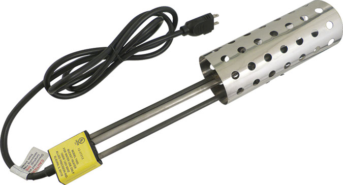 Preheat your mash before beginning the brewing process with this Electric Bucket Heater 1000w from MoreBeer! This handy little tool works in conjunction with a product like the Ranco or Johnson temperature controller by enabling you to set an exact hot liquid temperature on the controller, and then attaching it to the bucket heater. The temperature controller will turn off the bucket heater once it reaches your desired temperature. Our bucket water heater is designed to use with water in a bucket or cooler where an open flame cannot be used, and you can even use it to heat a bucket of water for cleaning with a powdered brewery wash.,This water bucket heater measures 17 inches from the handle to the tip and comes with a 6-foot long cord. It requires at least 6 inches of water for full submersion, and it can only be used with a maximum depth of 14 inches.  Unit has stainless steal heating element and guard.  Does not include clip for mounting. ,,Please Note - Having electrical devices around liquid can be hazardous, and should not be left unattended. Please use caution while using this device, and read the instruction manual prior to use.