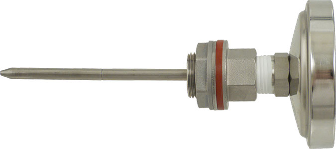 Upgrade any vessel and enjoy monitoring temperature from a safe distance! Gone are the days of opening kettle lids to check wort or mash temperatures! With the new Fermentap Weldless Thermometer, you can now upgrade any existing kettle or keg to read temperature from the outside!,,The Fermentap Weldless Thermometer has a 6 inch probe, making it ideal for use in your mash tun. The 6 inch stem is positioned more towards the middle of the mash, giving the thermometer probe more exposure resulting in a more accurate reading. This Weldless Thermometer will work in Kettles & Kegs! The thermometer is our Fermentap Dial Thermometer, and features a hermetically sealed face, all stainless construction, and a fast response to temperature change!,,Features:,,,Thermometer with 6" Probe and 3" Dial Face.,,,6" probe is long enough to get an accurate reading in Mash.,,,All Stainless Construction.,,,High Temperature Food Grade Silicone Gasket.,,,Will work great with Kettles & Kegs!,,,Requires a 1" hole to be drilled in the vessel for installation.,,,Replaces our WL111.